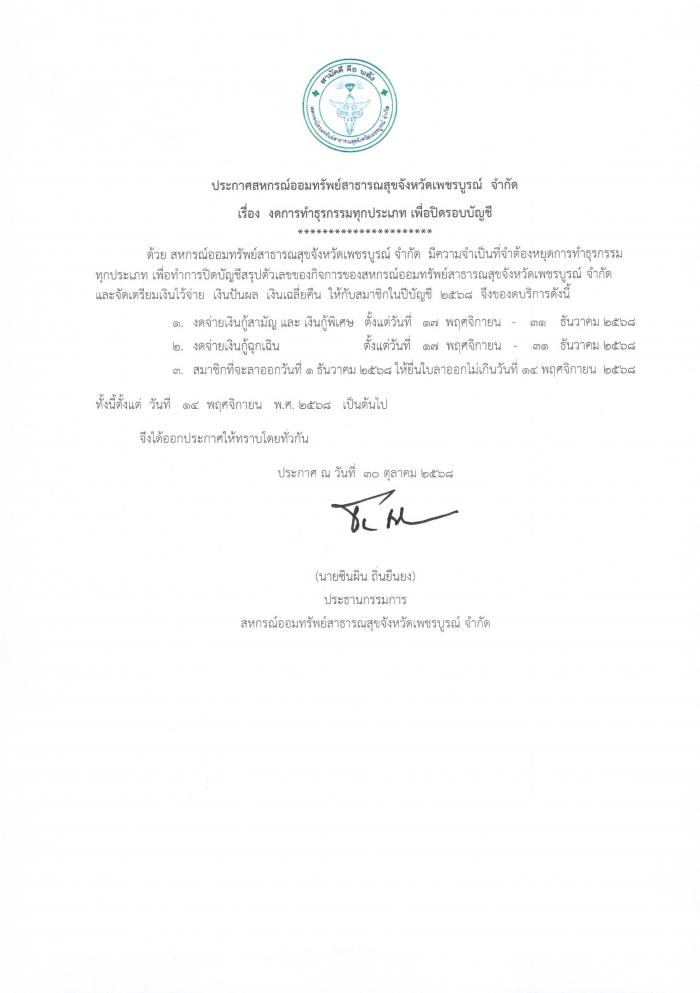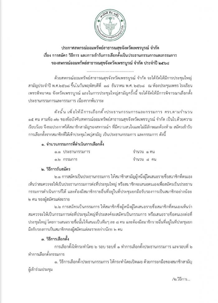 ประกาศการสมัคร วิธีการ และการเข้ารับการเลือกตั้งเป็นประธานกรรมการและกรรมการของสหกรณ์ออมทรัพย์สาธารณสุขจังหวัดเพชรบูรณ์ จำกัด ประจำปี 2568 ด้วยสหกรณ์ออมทรัพย์สาธารณสุขจังหวัดเพชรบูรณ์ จำกัด จะได้จัดให้มีการประชุมใหญ่สามัญประจำปี พ.ศ.2568 ขึ้นในวันที่ 18 ธันวาคม พ.ศ. 2568 ณ ห้องประชุมเพชร โรงเรียนเพชรพิทยาคมจังหวัดเพชรบูรณ์ และในการประชุมใหญ่สามัญครั้งนี้ จะได้จัดให้มีการพิจารณาเลือกตั้งประธานกรรมการและกรรมการ เนื่องจากพ้นวาระ ดังนั้น เพื่อให้มีการเลือกตั้งประธานกรรมการและกรรมการ ครบตามจำนวน 15 คน ตามข้อ 72 ของข้อบังคับสหกรณ์ออมทรัพย์สาธารณสุขจังหวัดเพชรบูรณ์ จำกัด เป็นไปด้วยความเรียบร้อย จึงขอประกาศให้สมาชิกสามัญของสหกรณ์ฯ ที่มีความสนใจและไม่มีลักษณะต้องห้าม สมัครเข้ารับการเลือกตั้งจากสมาชิกที่ได้เข้าประชุมใหญ่สามัญ เป็นประธานกรรมการ และกรรมการ ดังนี้ 1. จำนวนกรรมการที่ดำเนินการเลือกตั้ง 1.1 ประธานกรรมการ จำนวน 1 คน 1.2 กรรมการ จำนวน 7 คน